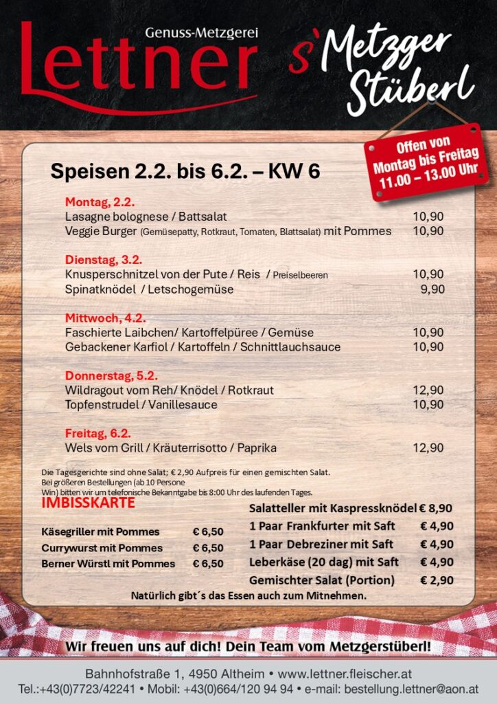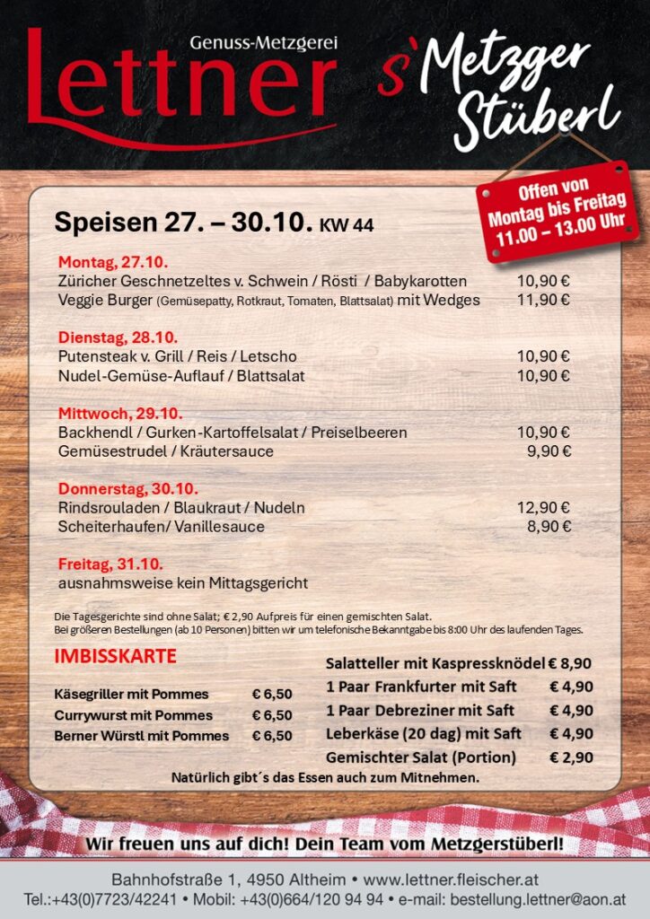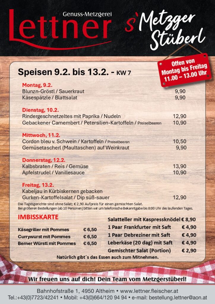 Frisch gekocht, schnell serviert! In unserem „Metzgerstüberl“ erwarten Sie täglich wechselnde, hausgemachte Schmankerl.